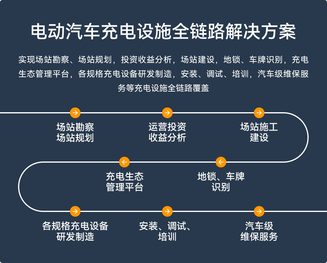 从场站勘察/规划、运营投资收益分析、场站施工建设、整站低压电器平台接入、充电生态管理平台、各规格充电研发制造、安装调试培训,到汽车级维保服务,覆盖充电解决方案运营全链路,助力商业伙伴稳健运营